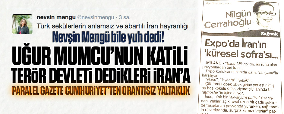 Düne kadar terör devleti ve katil dedikleri İran’a bugün Cumhuriyet gazetesi tarafından orantısız yaltaklık yapılıyor. MEDYAGUNDEM.COM- Düne kadar “terör devleti”, “Uğur Mumcu’nun katili”, “gerici şeriat ülkesi” dedikleri İran’dan bugün Cumhuriyet gazetesi orantısız övgülerle söz ediyor. Uğur Mumcu, Ahmet Taner Kışlalı, Muammer Aksoy ve Bahriye Üçok gibi çoğu Cumhuriyet gazetesi yazarı aydın, …