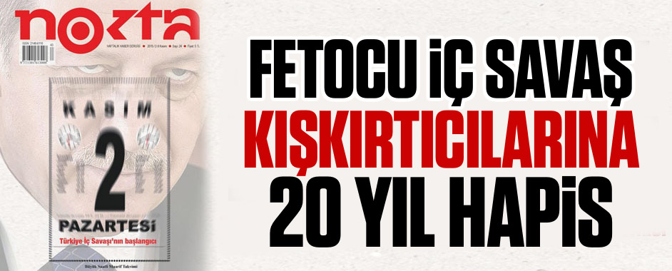 Fetullahçı Terör Örgütü’nün yayın organı Nokta Dergisi’nin genel yayın yönetmeni ve sorumlu yazı işleri müdürü hakkında 2 Kasım 2015 tarihli kışkırtıcı kapak sebebiyle 22,5 yıl hapis cezası verildi. İstanbul Cumhuriyet Başsavcılığı Basın Bürosu tarafından 2-8 Kasım 2015 tarihinde yayınlanan ve iç savaş çığırtkanlığı yapılan Nokta’nın kapak sayfasına ilişkin iddianame düzenlenmişti. …