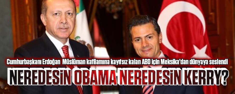 Cumhurbaşkanı Erdoğan, ABD’de öldürülen 3 genç için ABD Başkanı Obama’ya seslendi. Cumhurbaşkanı Recep Tayyip Erdoğan, Latin Amerika gezisinin son durağı Meksika’da, Meksika Cumhurbaşkanı Enrique Pena Nieto ile yaptığı görüşme sonrası ortak basın toplantısı düzenledi. Cumhurbaşkanı Erdoğan ABD’de 3 Müslüman gencin öldürülmesine ilişkin “Başkan Obama’nın, Sayın Kerry’nin, Biden’ın şu ana kadar …