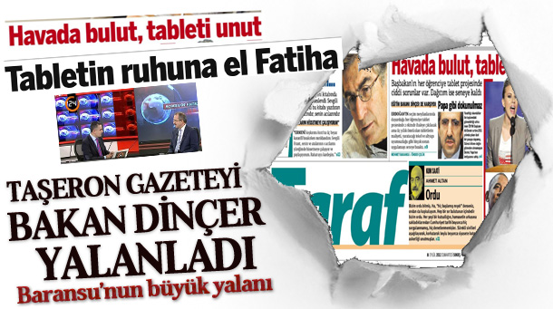MEDYAGÜNDEM- 24 haber televizyonunda, moderatörlüğünü Hakan Çelik’in üstlendiği “Hafta Sonu Moderatörü”ne canlı yayın konuğu olan Milli Eğitim Bakanı Ömer Dinçer, Taraf’ın bugünkü sürmanşetini yalanladı. Mehmet Baransu’nun imzasının da yer aldığı haberde, “Havada bulut, tableti unut” başlığı atıldı, iç sayfada ise “Tabletin ruhuna el Fatiha” denildi. Haberde, “Başbakan’ın her öğrenciye tablet …