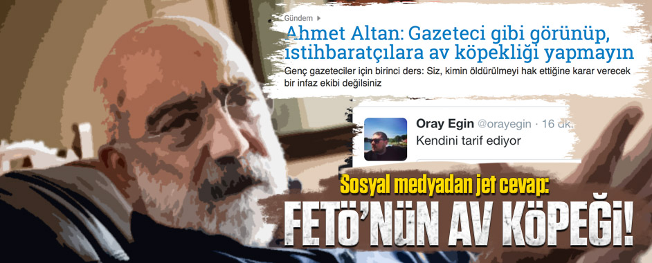 FETÖ’nün kullandığı gazeteci Ahmet Altan utanmadan “Gazeteci gibi görünüp, istihbaratçılara av köpekliği yapmayın” diye yazdı. Cevabı da sosyal medyadan geldi; “kendini tarif ediyor!” Yani FETÖ’nün av köpeği! MEDYAGUNDEM.COM- Fetocu terör örgütünün (FETÖ) kullandığı gazeteci Ahmet Altan, Taraf diye FETÖ tetikçisi gazetede Gülenci teröristlerin hedef gösterdiği adamların üzerine saldırmak gibi bir görev yürütmemiş gibi, …