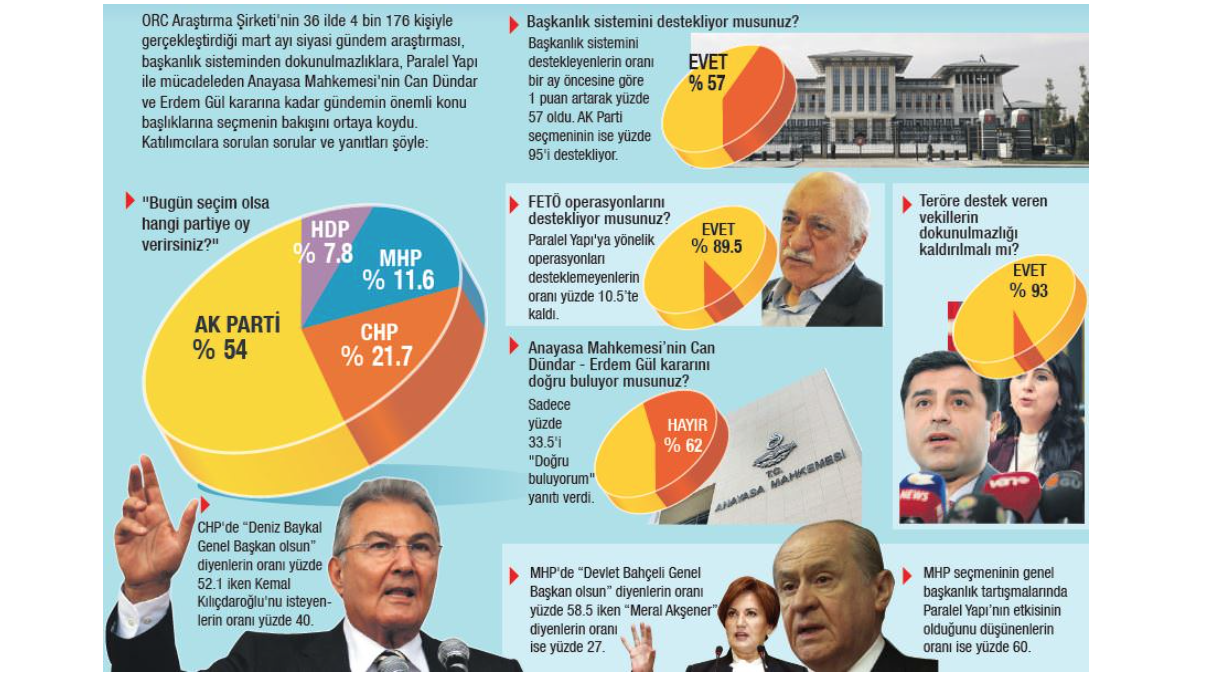 ORC’nin araştırmasına göre başkanlık sistemine destek yüzde 57’ye çıktı. HDP’li vekillerin dokunulmazlığının kaldırılmasını isteyenlerin oranı ise yüzde 93. FETÖ operasyonlarına destek verenlerin oranı yüzde 89.5. AYM’nin Dündar-Gül kararına karşı çıkanlar ise yüzde 62. ORC Araştırma Şirketi’nin 36 ilde 4 bin 176 kişiyle gerçekleştirdiği mart ayı siyasi gündem araştırması, başkanlık sisteminden …