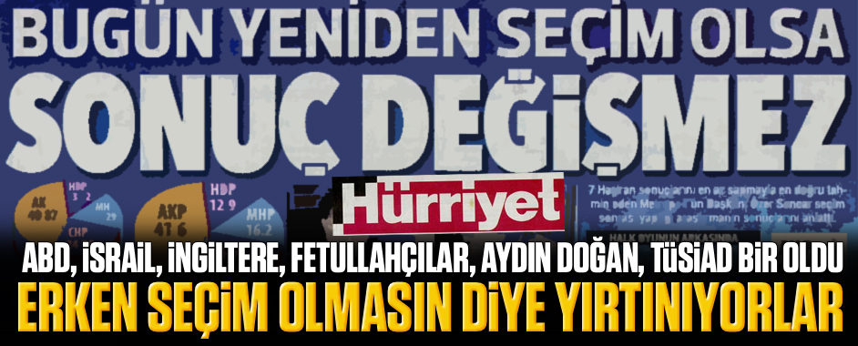 Şer cephesi “erken seçim olmasın” diye çırpınıyor. MEDYAGUNDEM.COM- ABD, İsrail, İngiltere, Fetullahçı terör örgütü, Aydın Doğan, TÜSİAD, CHP… Alayı erken seçim istemiyor. İşte bugünkü Hürriyet’in manşeti… “Bugün yeniden seçim olsa sonuç değişmez” başlığı atılmış… Söyleyen kim Fetullahçıların anketçisi… Manşette kimin imzası var? Aydın Doğan’ın “garsonu” Ahmet Hakan’ın… Metropoll araştırma şirketi …