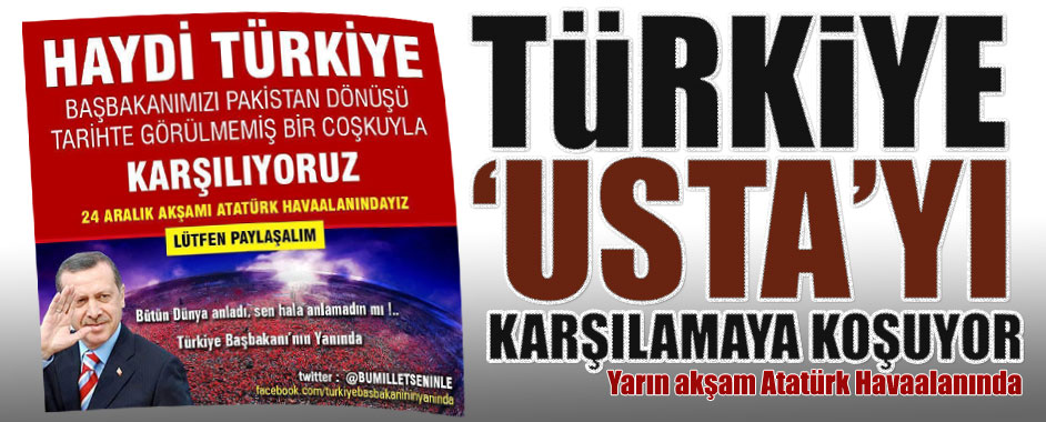 MEDYAGUNDEM.COM- Cemaatin taşeronu olduğu uluslararası tezgahla bir kez daha darbe girişimine maruz kalan Başbakan Erdoğan için Türkiye yarın akşam Pakistan dönüşü Atatürk Havaaalanında büyük karşılamaya hazırlanıyor. “Erdoğan’ı size yedirmeyeceğiz” diyenler yarın akşam Erdoğan’a görkemli bir karşılamayla darbeci ve cuntacılara da bir kez daha mesajlarını vermiş olacak. İşte karşılama duyurusu:
