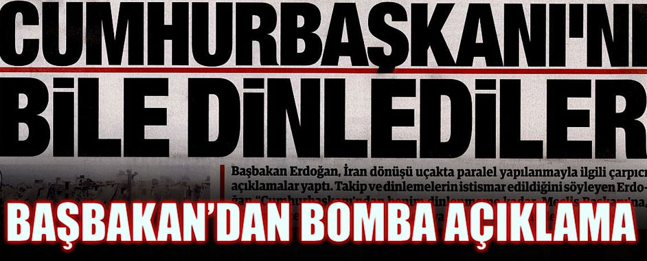 Başbakan Erdoğan, paralel yapılanmayla ilgili çarpıcı açıklamalar yaptı: Cumhurbaşkanı’ndan Meclis Başkanı’na, ailelerimize, çocuklarımıza varıncaya kadar herkesi dinlemişler. Başbakan Tayyip Erdoğan, İran ziyaretinin ardından uçakta çarpıcı değerlendirmelerde bulundu. Gündeme ilişkin soruları cevaplandıran Başbakan Erdoğan, paralel yapıyla ilgili çok önemli bilgiler verdi. İşte Erdoğan’ın sorulara verdiği cevaplar: Demokratikleşme paketi mi geliyor? Biliyorsunuz …