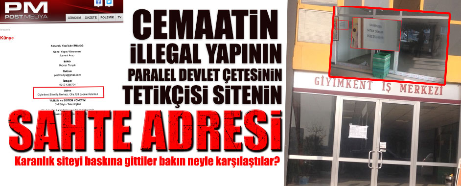 MEDYAGUNDEM.COM- Cemaatin, devlet içindeki illegal yapının, paralel devlet çetesinin tetikçisi Postmedya isimli internet sitesinin sahte merkezi deşifre edildi. Çetenin kullandığı tetikçilerin künyede gösterdikleri adreste olmadıkları belgelendi. genelgundem.com sitesi Postmedya denilen illegal çetenin sesine baskın düzenledi ve tüm gerçeği deşifre etti. İşte o haber: ————————————————— Postmedya’nın duvarında ‘satılık’ yazıyor! 17 Aralık …
