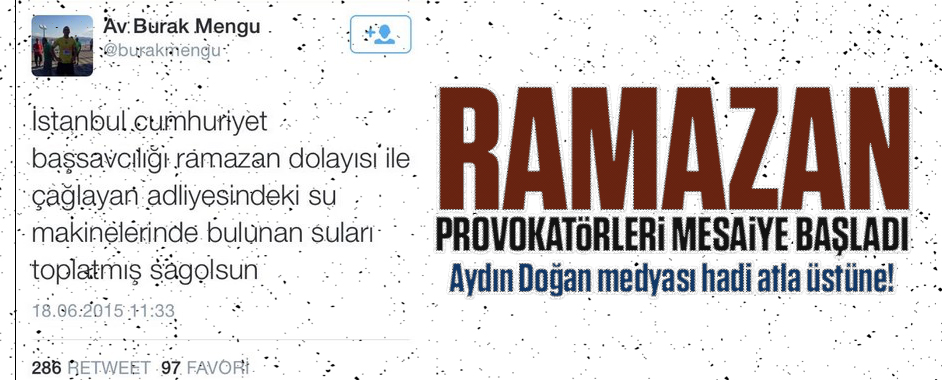 Çağlayan Adliyesi’nde bir avukat, Ramazan nedeniyle adliyede su satılmadığını iddia etti. Tweet, Gezi dönemindeki yalanları hatırlattı. Ramazan’ın gelmesiyle birlikte provokasyonlar da başladı. “Oruç tumayanı dövdüler” haberiyle açılışı yapan soL’a sosyal medyadan da çeşitli yalanlarla destek geliyor. Bunlardan biri de CNN Türk’te akşam haberlerini sunan spiker Nevşin Mengü’nün kardeşi Avukat Burak …