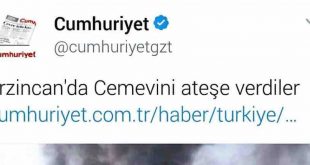 Fetullahçı terör örgütü ve PKK’nın yayın organı gibi çizgi izleyen, Türkiye’nin milli çıkarlarına kasıtlı bir düşmanlık yapan Cumhuriyet gazetesi, yalan haberlerle de toplumda provokasyona zemin hazırlamak için bir gazete gibi değil, terör paçavrası olarak faaliyet yürütüyor. medyagundem.com Cumhuriyet’in son yalan ve provokasyonu şu: Twitter’daki resmi hesabından Cumhuriyet’in girdiği başlık “Erzincan’da …