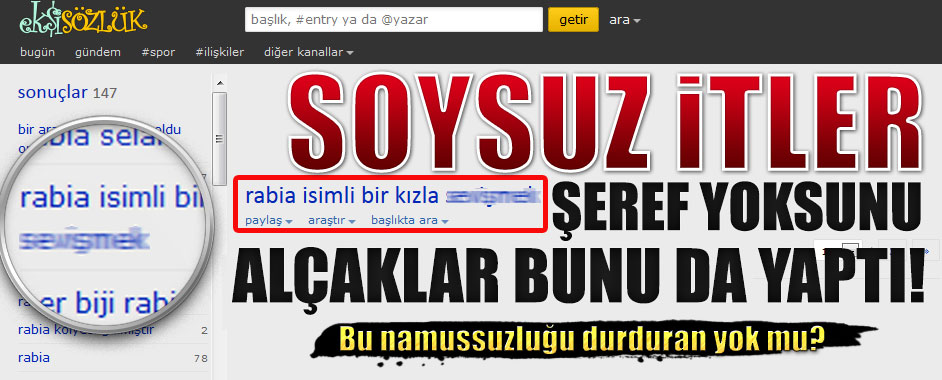 Şimdi de Mısır’daki darbe mağduru Müslüman halkın direniş sembolü olan Rabia ismine dil uzatıp; Müslümanlar arasında sıkça kullanılan isimlerden olan Rabia’yı ahlaksızlıklarına meze yapmaya kalkıştılar. Kurucusu Sedat Kapanoğlu’nun Yahudi asıllı olduğunu ortaya çıkardığımız Ekşi Sözlük’te gün geçmiyor ki, Müslümanlar, dinimiz ve Hz. Peygamber hedef alınmasın! Hergün iğrenç başlıklar altında sayfalar …