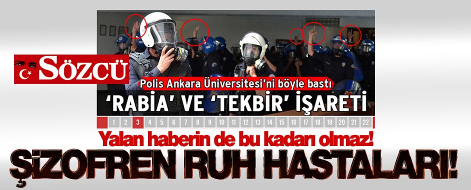 MEDYAGUNDEM.COM- Gezi kalkışmasından bu yana süren belli bir medya organlarında ve sosyal medyada yalan haberlerle provokasyon Kobani bahaneli sokak teröründe de devrede. Sözcü gazetesinin internet sitesi de yalan haber ve provokasyonda ön sırada yarış tutuyor. Son yalanları da polisin Ankara Üniversitesi’ndeki olaylara “rabia” ve “tekbir” işaretleriyle müdahale ettiği zırvası oldu. …