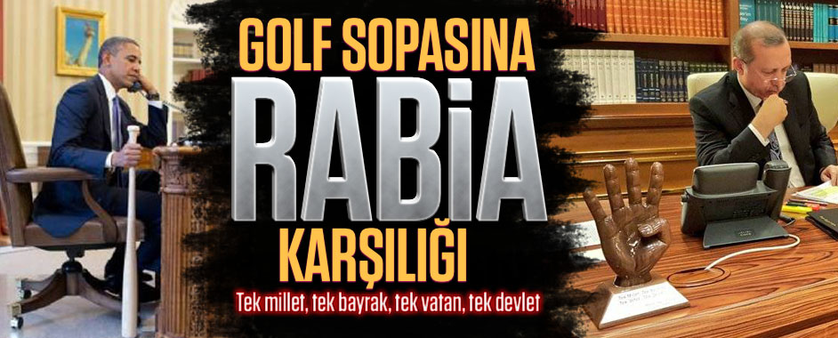 Cumhurbaşkanı Erdoğan ile ABD Başkanı Obama, Suriye’deki son gelişmelere ilişkin telefon görüşmesi yaptı. Mustafa Varank, Erdoğan’ın konuşma esnasında çekilmiş fotoğrafını paylaşırken masada bulunan Rabia sembolü dikkat çekti. Fotoğrafın bir önemi de, Obama’nın o golf sopalı fotoğrafına Erdoğan’dan Rabia’lı mesaj gelmiş olması… Rabia’yı sık sık kullanan Erdoğan anlamını da hep “Tek …