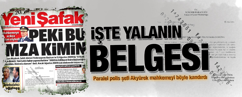 Ramazan Akyürek, Şehit Aileleri Federasyonu Başkanı’nı 2009’da “El Kaideci” diye dinletti. Yeni Şafak haber yapınca hakime “2008’de İstihbarat Daire Başkanlığı’ndan ayrıldım. Dinlemiş olamam” dedi. Ancak Ağustos 2009’daki dinlemelerde yer alan imzası Akyürek’in doğru söylemediğini ortaya koyuyor. Şehit Aileleri Federasyonu Başkanı Hamit Köse’yi ‘El Kaide’ iddiasıyla sahte isimle dinlettiren eski İstihbarat …