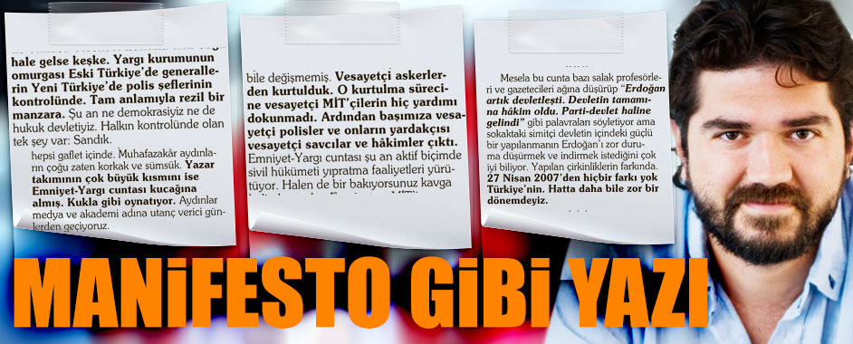 MEDYAGUNDEM.COM- Rasim Ozan Kütahyalı bugün de Sabah gazetesinde manifesto gibi bir yazıyla cemaat içindeki Emniyet-Yargı cuntasını yazdı. Bazı polis şeflerinin yargıyı kontrol ettiğinin altını çizen Kütahyalı, “Mesela bu cunta bazı salak profesörleri ve gazetecileri ağına düşürüp ‘Erdoğan artık devletleşti. Devletin tamamına hâkim oldu. Parti-devlet haline gelindi’ gibi palavraları söyletiyor ama …
