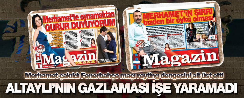 MEDYAGÜNDEM- Dün gecenin reyting sonuçları belli oldu. Star TV’nin Muhteşem Yüzyıl’ı tüm kategorilerde zirvedeki yerini korurken, atv’de yayınlanan Fenerbahçe ile 1461 Trabzon arasındaki Türkiye Kupası maçı, reyting dengelerini alt üst etti. Fenerbahçe-1461 Trabzon arasındaki maç, Muhteşem Yüzyıl’ın ardından ikinci oldu. Ama asıl şoku Kanal D’nin Merhamet dizisi yaşadı. Hande Altaylı’nın …