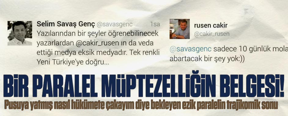 MEDYAGUNDEM.COM- Son olarak paralel örgütün de arkasında olduğu Gezi kalkışmasında provokatif çıkışlarıyla dikkat çeken gazeteci Ruşen Çakır da topa girdiyse tamamdır, Cemaat gerçekten bitmiştir. Paralel örgütün güçlü olduğu bir dönemde sesini çıkarmayan, hatta Cemaat ile dirsek temasına giren, en yakın dostu gazeteci Kadri Gürsel’in tam bir paralel örgüt tetikçisi olduğu …