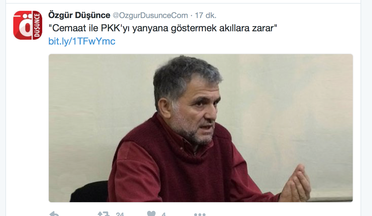 Dün Gülen örgütünün sosyal medyadaki trol hesabı Fuat Avni üzerinden yürüttüğü “sokak gösterisi” operasyonuna hiç kimse destek vermedi. Milyonlarca insanı sokaklara dökme hayaliyle kendilerini kurtaracaklarını sanan paralel çeteye sadece Türk Solu isimli provokatör, faşist, katillere övgüler düzen bir dergi destek verdi. Ruşen Çakır’ın Ekrem Dumanlı ile ilgili bir tiviti Gülen …