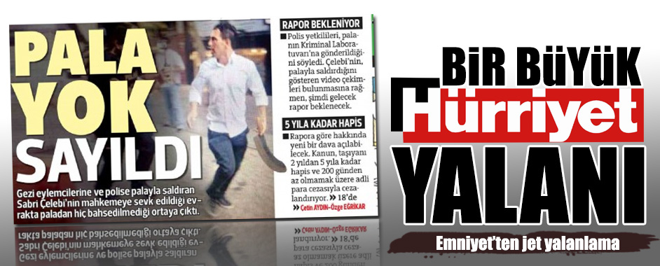 Emniyet Genel Müdürlüğü (EGM), İstanbul’da Taksim Gezi Parkı olayları sırasında “eylemcilere ve polise palayla saldıran kişinin mahkemeye sevk edildiği evrakta paladan hiç bahsedilmediği” iddiasını yalanladı. Hürriyet gazetesi bugün birinci sayfasından yayınladığı haberde “Pala yok sayıldı” demişti. EGM, resmi twitter hesabından takipçileriyle bir gazetede yer alan “Pala yok sayıldı” başlıklı habere …