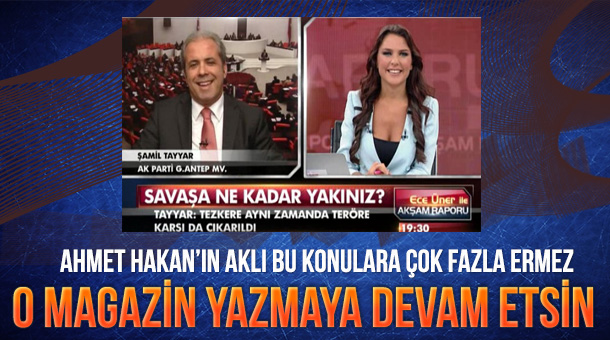 AK Parti Gaziantep Milletvekili Şamil Tayyar, Hürriyet yazarı Ahmet Hakan’ı adeta bombardımana tuttu… MHP Genel Merkezi’nde ülkücü gençlere verdiği konferansta kendisine gönderme yapan Ahmet Hakan’a, Şamil Tayyar’ın cevabı sert oldu. Beyaz Tv ekranlarında yayınlanan “Bire Bir” programında Ahmet Hakan’la ilgili bir soru üzerine konuşan Şamil Tayyar “Ahmet Hakan benim milletvekili …