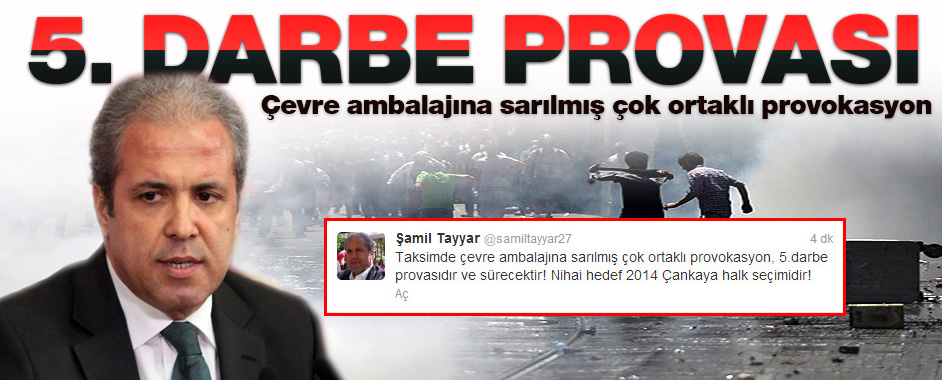 AK Parti Gaziantep Milletvekili Şamil Tayyar, Taksim Gezi Parkı’nda ağaç ve AVM bahanesiyle başlayan ve giderek büyüyen olayların 5. darbe provası olduğunu söyledi. Şamil Tayyar, Twitter’dan yaptığı açıklamada Taksim’de yaşanan olayların 5. darbe provası olduğunu kaydederek, “Taksimde çevre ambalajına sarılmış çok ortaklı provokasyon, 5.darbe provasıdır ve sürecektir! Nihai hedef 2014 …