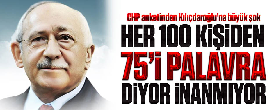 CHP’nin yaptırdığı ankete göre; Kılıçdaroğlu’nun seçim vaatlerine her 100 kişiden 75’i inanmıyor. Cumhuriyet Halk Partisi Genel Başkanı Kemal Kılıçdaroğlu’nun seçim vaatlerinin seçmen üzerindeki etkisini ölçmek için partisinin yaptırdığı anketin sonuçlarını, Sözcü gazetesi yazarı Saygı Öztürk köşesinden yayınladı. CHP Genel Başkanı Kemal Kılıçdaroğlu’nun miting meydanlarında açıkladığı, seçim bildirgesinde yer alan projelerinin …