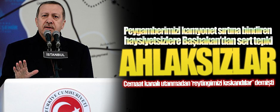 Gülen örgütünün kanalı Samanyolu TV’de, Peygamberimizin gökten nurla indirilip kamyonet kasasında tekrar gönderildiği sahneye Başbakan Erdoğan’dan da sert tepki geldi. Başbakan Erdoğan’dan Haliç Metro geçiş köprüsü açılışında önemli açıklamalarda bulundu. Erdoğan Paralel Yapı’ya çok sert çıktı. Başbakan “Bunlar başörtüsü düşmanlarıyla işbirliği içindeler. Peygamber efendimizi kamyonete bindirecek kadar ahlaksızlar.” dedi. “PARALEL …