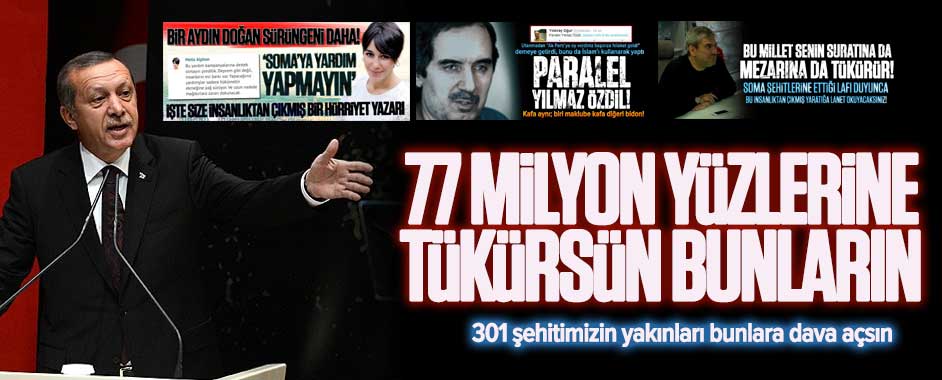 Başbakan Erdoğan AK Parti istişare toplantısında yaptığı konuşmada Doğan Grubu yazarları Yılmaz Özdil, Yazgülü Aldoğan ve Melis Alphan ve Zaman yazarı Ali Ünal’ın Soma’da şehit olan işçiler hakkındaki söylemleri için, “301 şehidimize bu hakareti yapanlar aslında 77 milyonun yüzüne tükürmesi gereken insanlardır” dedi. Erdoğan’ın konuşmasından satırbaşları şöyle: Şehit madencilerimize AK …