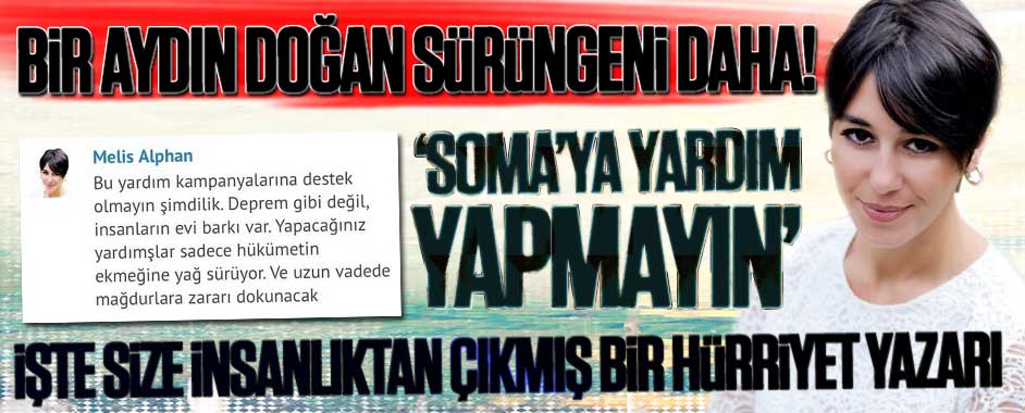MEDYAGUNDEM.COM- Nerede insanlıktan çıkmış bir gazeteci müsveddesi varsa, nerede insanlığın yüzkarası söylemle vicdansızlar korosu yer alıyorsa, hepsi Aydın Doğan medyasında toplanmış. Yılmaz Özdil, Yazgülü Aldoğan’dan sonra şimdi de Hürriyet yazarı Melis Alphan, insan olmadığını kanıtlayan bir çıkış yaptı. Manisa’nın Soma ilçesinde 301 maden işçisinin şehit olduğu kaza sonrası, bölgeye devlet dışında …