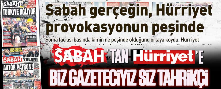 MEDYAGUNDEM.COM- Sabah gazetesi Soma’daki facia ve acı üzerinden provokasyon yapan, attığı manşetlerle ölü bedenler üzerinden siyasi vampirlik peşinde koşan Hürriyet gazetesine bugün de sayfalarından “Biz gazeteci siz tahrikçi” başlıklı bir haberle cevap verdi. Sabah’ta yer alan haber şöyle: Soma faciası basında kimin ne peşinde olduğunu ortaya koydu. Hürriyet Soma’yı siyasi …