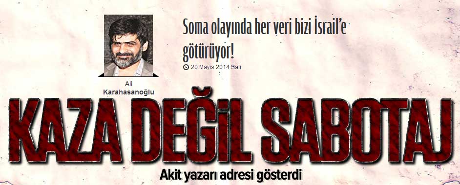 Koç Müzesi’nde aksilik oldu, Soma’da başardılar! Ali İhsan Karahasanoğlu/Yeni Akit “Yuh size.. Soma’yı da İsrail’e bağladınız ya.. Soma’nın da arkasında, derin işler olduğunu iddia ettiniz ya.. Apaçık bir ihmal sonucu yaşanmış bir kazayı da, sabotaj iddiası ile sundunuz ya!” diyenler için.. Küçük bir hafıza tazelemesi yapalım.. Ergenekon iddianamesinden bir iktibas …