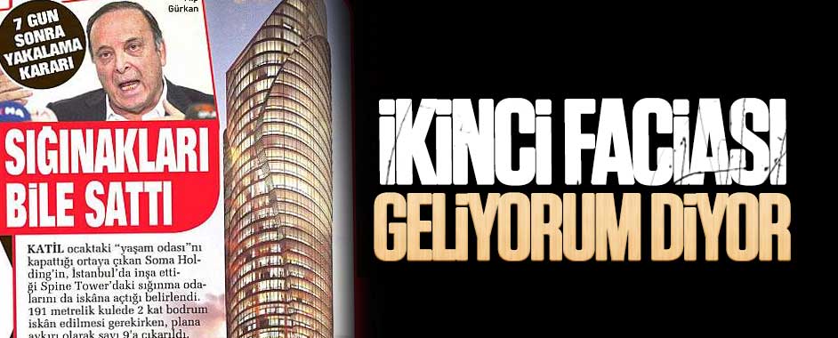 Soma’daki ölüm madeninin sahibi Alp Gürkan’ın İstanbul’da inşa ettiği Spine Tower’ın inşaatı için istediği krediyi yabancı banka, “Ya madeninde kaza olursa… Bunu kamuoyuna açıklayamam” diyerek talebi geri çevirmiş. Türkiye’nin gözü kulağı Soma’da… Herkes korkunç kazada hayatını kaybedenler için ağlarken, dün maden sahibi şirketin yaptığı basın toplantısı tartışmalara ayrı bir boyut …