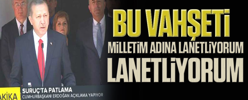 Cumhurbaşkanı Recep Tayyip Erdoğan, Suruç’ta yaşanan patlamayla ilgili konuştu. KKTC Cumhurbaşkanı Mustafa Akıncı’nın davetiyle Lefkoşa’ya giden Cumhurbaşkanı Recep Tayyip Erdoğan, Şanlıurfa’nın Suruç İlçesi’nde yaşanan patlamayla ilgili açıklamalarda bulundu. “TERÖRÜN DİNİ, IRKI YOKTUR” İşte Erdoğan’ın açıklamaları; “Bu vahşeti işleyenleri ben de şahsım ve milletim adına lanetliyorum ve kınıyorum. Haberi uçakta aldım …