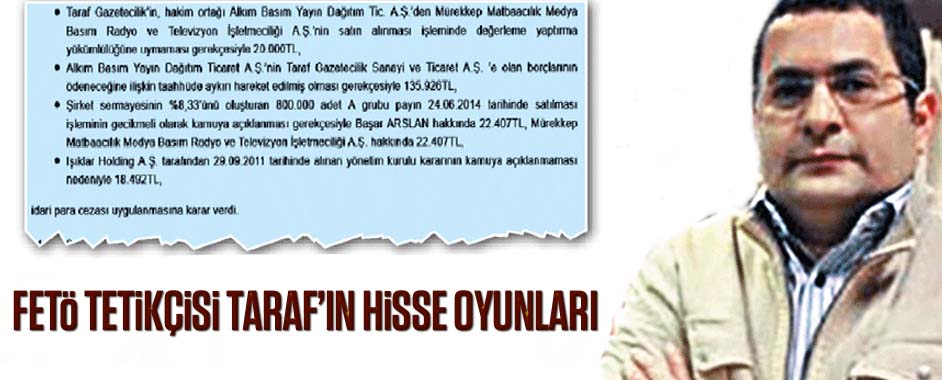 Gülen örgütünün ‘el altından’ fonlayarak tetikçi olarak kullandığı iddia edilen Taraf gazetesinin patronu Başar Arslan’ın hisse oyunları Sermaye Piyasası Kurulu’na (SPK) takıldı. Borsaya girdikten sonra finansal yapısı iyice karışık bir hâl alan Taraf gazetesi ve yan şirketlerinin hisse sahtekârlıkları nedeniyle SPK tarafından toplamı 200 bin TL’yi bulan 4 ceza aldığı …