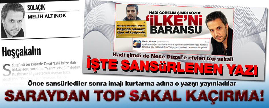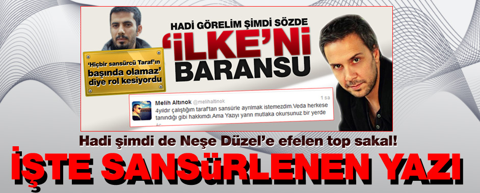 MEDYAGÜNDEM- Taraf önce bir yazarını sansürledi, Taraf’ın taze genel yayın yönetmeninin “sansürcü” olduğu tartışmaları başladı. Hele hele “topsakal Baransu”nun “Bu gazetenin başında bir sansürcü oturamaz” sözlerinin ardından Taraf’ta bir yazarın veda yazısının sansürlenmesi haliyle Baransu’yu fena halde açığa düşürdü. Melih Altınok’tan söz ediyoruz. Taraf’a veda ettiği yazısı sansürlenen Altınok’un o …