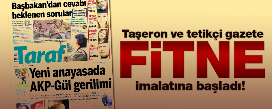 MEDYAGÜNDEM- Tam da karanlık operasyoncuların istediği çizgiye geldi. Taraf, operasyonel yayınlarına başladı. Tüm derdi “fitne çıkarmak” olan gazete bugün gerek manşetiyle gerekse de sürmanşetiyle karanlık misyonunu bir kez daha yerine getirdi. Taraf çözüm sürecine dair tıpkı Sözcü gibi tavır takınarak, süreci zehirleyecek sorular ortaya attı, sürece dair endişeli sorularla aslında …