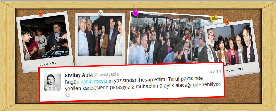 MEDYAGÜNDEM- Daha çalışanına maaş veremeyen Taraf gazetesinin patronu, gazetenin 2000. sayısı için şaraplı karidesli parti verdi. Yeni yayın yönetmeni Neşe Düzel ve Taraf’ın patronu Başar Arslan katıldığı bir parti ile gazetenin 2000. sayısının pastasını kestiler. Taraf yazarı Hıdır Geviş’in bugünkü yazısında o partiye ilginç bir detay dikkat çekiciydi. “…Ama tam …