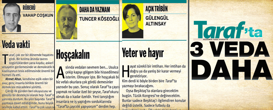 MEDYAGÜNDEM- Bugün de Taraf’a 3 yazarı veda etti. Yazarlar Tuncer Köseoğlu, Vahap Coşkun ve Gülengül Altınsay bugün yazdıkları veda yazılarıyla Taraf’tan ayrıldılar. Gülengül Altınsay’ın “Yeter ve hayır” başlıklı veda yazısındaki, “Kişisel olarak Barış Süreci’ne ‘yeter ve evet’ diyenlerdenim. Ama maalesef gazetede yaşanan sürece ‘yeter ve hayır’ diyor, ayrılıyorum.” ifadeleri çarpıcıydı. medyagundem.com