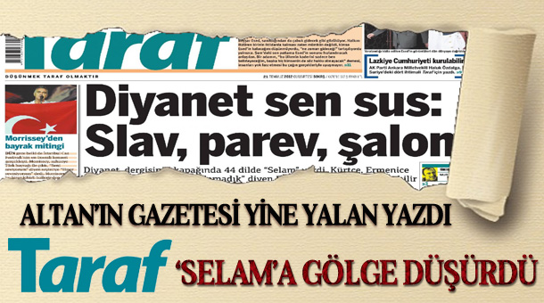 MEDYAGÜNDEM- Taraf’ın bugünkü manşetinde yer alan “Diyanet sen sus: Slav, parev, şalom” başlıklı haber, Diyanet İşleri Başkanlığı tarafından yalanlandı. Yapılan açıklamada Taraf’ın haberinin tamamen yalan olduğu belirtildi. Açıklamada şöyle denildi: *** Bugün Taraf Gazetesinde manşetten verilen “Diyanet Sen Sus” başlıklı haberde yer alan, “Diyanet dergisinde Ramazan ayının ana teması olan selama …