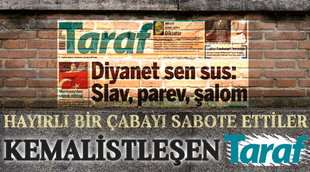Taraf’tan bu kadar Kemalistlik beklemezdik Her yönüyle hayırlı bir çaba, tamamen iyi niyetli bir girişim ancak bu şekilde sabote edilebilirdi. Taraf Gazetesi’nin Diyanet’in Selam kampanyasına karşı attığı manşetten bahsediyorum. Malum, Diyanet bu yıl Ramazan ayında vaazlarında, söylemlerinde Selam kavramını önplana çıkarmayı kararlaştırmış. Diyanet Dergisi’nin kapağı da bu kampanyayı duyurmak üzere …