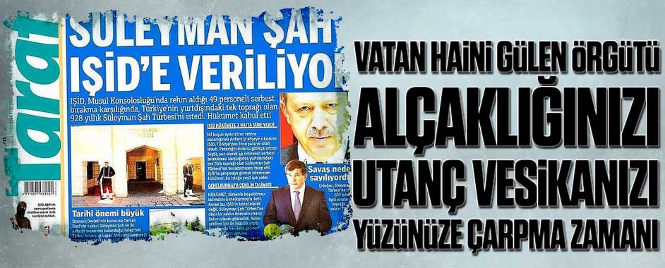 IŞİD’in elindeki 49 Türk’ün serbest kalması Cemaat’e yakın Taraf gazetesinin Süleyman Şah Türbesi ile ilgili haberinin bugün resmen yalanlanmasına neden oldu.. Cemaat’in yayın organlarından Taraf gazetesi, bundan tam 1 ay önce Süleyman Şah Türbesi ile ilgili bir iddia ortaya atmıştı. “49 TÜRK’E KARŞILIK SÜLEYMAN ŞAH TÜRBESİ VERİLECEK” İDDİASI Taraf, haberinde …