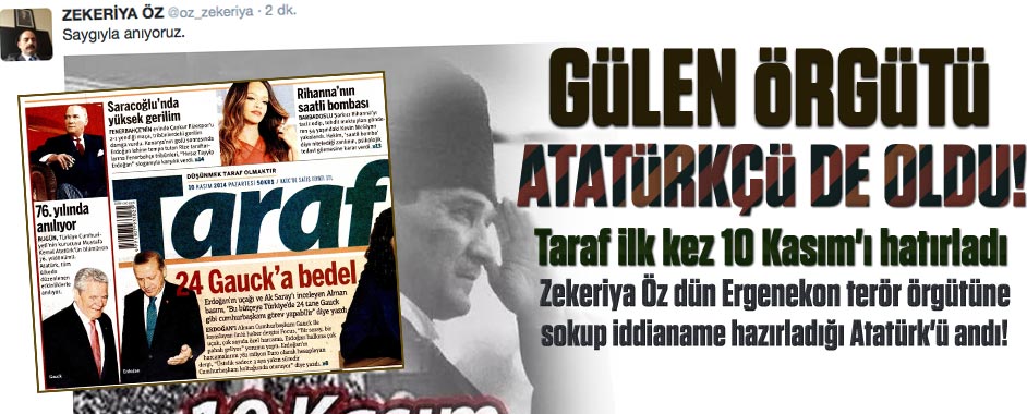 MEDYAGUNDEM.COM- Bugün 10 Kasım. Türkiye Cumhuriyeti’nin kurucusu Gazi Mustafa Kemal Atatürk’ün vefatının 76’ncı yıldönümü. Ve Atatürk’ün ölümünün 76. yıldönümünde Gülen örgütü de ilk kez “Atatürkçü” oldu. 7 yaşında olan Taraf, yayın hayatında ilk kez 10 Kasım’ı hatırladı! Taraf gazetesi 15 Kasım 2007 tarihinde yayın hayatına merhaba dedi. Ve o günden …