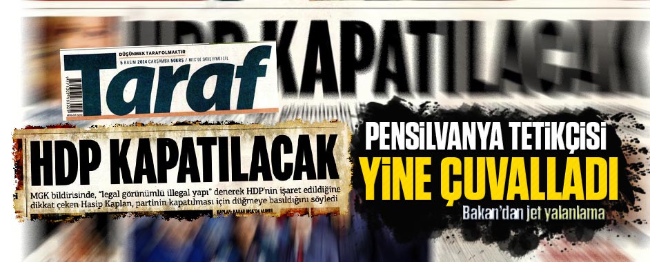 MEDYAGUNDEM.COM- Gülen örgütünün nasıl bir yalan, iftira, kara propaganda merkezi gibi çalıştığını da görmek için son dönemde Taraf gazetesinin manşetlerine bakmanız yeterli… Kaynağı belirsiz, hiç bir dayanağı olmayan uyduruk iddialarla hükümete karşı Gülen örgütünün açtığı savaşta tetikçilik görevi yürüten Taraf’ın bugün de attığı sürmanşet, paralel örgüte de zaman zaman destek …