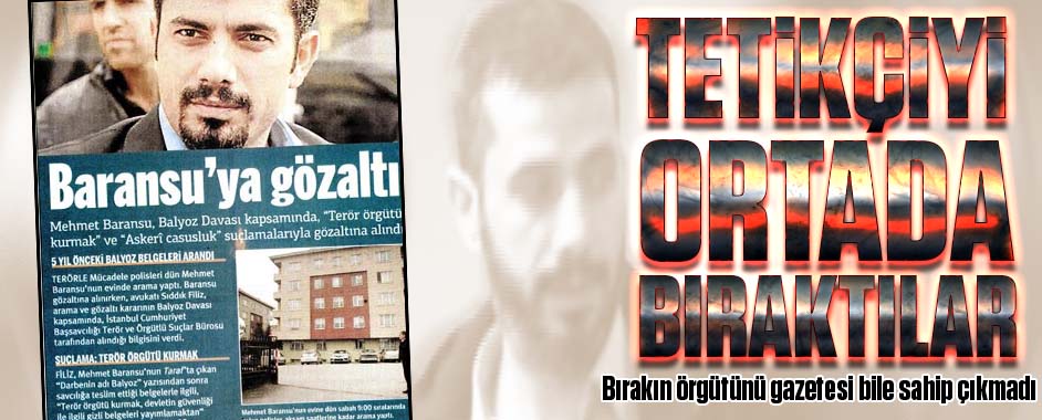 Gülen örgütünün “tetikçisi” Mehmet Baransu gözaltına alındı, kimse sahip çıkmadı, özellikle yazarı olduğu gazete. MEDYAGUNDEM.COM- Taraf gazetesinin bavulcu muhabiri, paralel terör örgütünün tetikçisi Mehmet Baransu, dün sabah İstanbul Cumhuriyet Başsavcılığı Terör ve Örgütlü Suçlar Bürosu tarafından yürütülen bir soruşturma kapsamında gözaltına alındı. Evinde polis tarafından yaklaşık 12 saat arama yapılan …