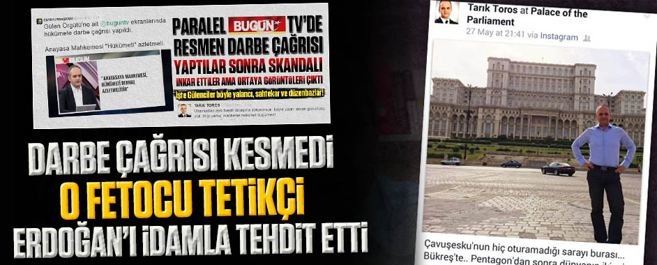 Fetullahçı Terör Örgütü medyasının yazarı Tarık Toros, Menderes’e yapılan darbenin yıldönümünde Cumhurbaşkanı Erdoğan’ı idam ile tehdit etti. Romanya Devlet Başkanı sarayının önünde poz veren Tarık Toros Facebook hesabından yaptığı paylaşımda Erdoğan’ın sözleri ile Çavuşesku arasında anlamsız bağlantılar kurarak idam imasında bulundu. Toros daha önce de darbe çağrısı yapmıştı. CUMHURBAŞKANI’NIN …