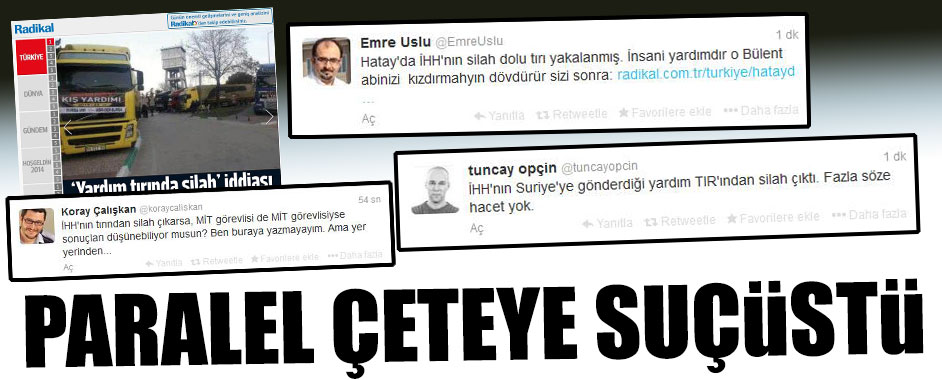 MEDYAGUNDEM.COM- İHH üzerinden Türkiye’yi radikal terör gruplarına silah yardımı yapıyormuş gibi gösterme amaçlı İsrail planı bu gece yerli tetikçileriyle devreye sokuldu. Cemaatin tetikçileri yine yalan haberlerle Türkiye’nin başına bir “tezgah” kurmaya kalkıştı, operasyonları ellerinde patladı. Yine hep aynı isimler sahneye çıktı, yine aynı isimler tek bir yerden düğmeye basılmış gibi …