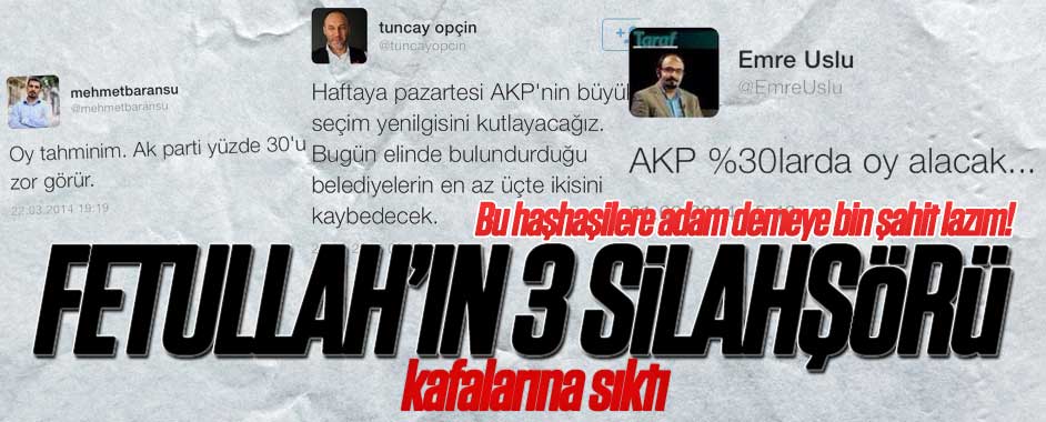 MEDYAGUNDEM.COM- O kadar çok yalan söylediler, o kadar çok iftira attılar, o kadar çok hak yediler ki, kalplerinin karalığı suratlarına vurdu. Fetullah’ın top sakallı silahşörleri ortalıkta terör estirdiler. Tuzak kurdulari komplo hazırladılar, hep yalan yazdılar. Ve millet şamarı suratlarına yapıştırdı. Emre Uslu, Mehmet Baransu ve Tuncay Opçin seçimden önce bakın …