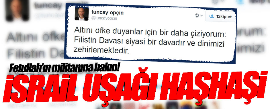 Fetullah Gülen grubunun yayın organı Bugün gazetesi muhabiri Tuncay Opçin, çirkinliklerine devam ediyor. Tuncay Opçin sosyal paylaşım sitesi twitter hesabından daha önce gazeteci-yazar Nihal Bengisu Karaca için “başörtüsü kontenjanından yazar” şeklinde çirkin bir ifade kullanırken, şimdi ise Filistin davasını lekelemeye çalıştı. Opçin; “Filistin Davası siyasi bir davadır ve dinimizi zehirlemektedir” …