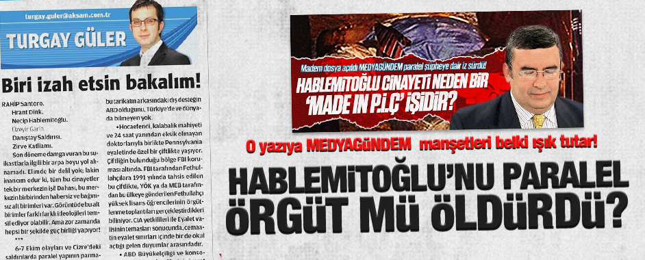 Akşam gazetesi yazarı Turgay Güler bugün çarpıcı sorularla yakın tarihte işlenen bazı cinayetlerin arkasındaki paralel şüpheyi yazdı. “Biri izah etsin bakalım” diyen Güler özellikle Necip Hablemitoğlu cinayetinin altını çizdi. Güler’in yazısını MEDYAGÜNDEM’in o manşetleriyle birlikte okursanız sanırız biraz olsun izah için yol kat etmiş olursunuz. İşte yazısı: TEK BİR MERKEZİN …