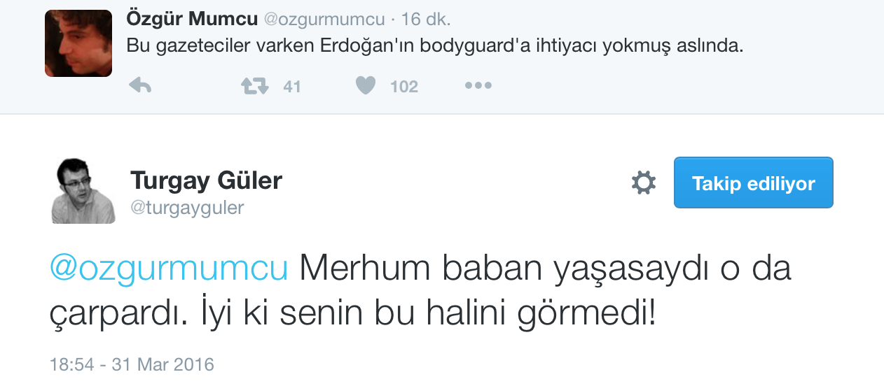 FETÖ-PKK gazetesi Cumhuriyet’in ciciş oğlanı Özgür Mumcu’ya fena kapak yaptılar! Hayatta olsa evlatlıktan reddeceğini tahmin ettiğimiz, babasının mirasını çarçur eden hayırsız evlat Özgür Mumcu, kariyerini troll-yazar olarak sürdürüyor. Twitter’da Güneş gazetesi genel yayın yönetmeni Turgay Güler’e bulaştı, ama ağzının payını fena aldı… Güler Brookings Enstitüsü’nde Erdoğan’ın konuşma yaptığı salona sızan FETÖ’nün …