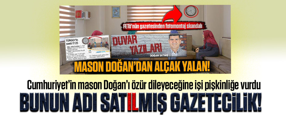 FETÖ’nün desteklediği Cumhuriyet’te bugün yine alçakça bit yalana imza atıldı. Yalanın sahibi ise Mason Doğan… Türk medyasındaki mason gazetecilerden Doğan Satmış’ın “Duvar yazıları” köşesinde TÜRGEV’e fotomontaj bir fotoğrafla iftira atıldı. Doğan Satmış, TÜRGEV Vakfı’nın Yönetim Kurulu üyesi olan Bilal Erdoğan’a karşı kullandığı fotoğrafta duvarda asılı olan saatin 17:25’i gösterdiğini iddia etti. …