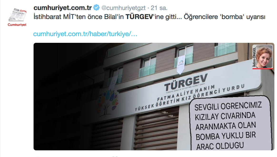 FETÖ tarafından finanse edilen Cumhuriyet Gazetesi yine alçakça bir iftiraya imza attı. Ankara’daki bombalı saldırıdan 5 gün sonra atılan bir mesajı bombalı saldırıdan önce atılmış gibi haber yapan FETÖ’nün gazetesine TÜRGEV’den sert cevap geldi. Haberinde Ankara’da 28 kişinin hayatını kaybettiği patlamadan önce TÜRGEV’in öğrencilere “Kızılay’a gitmeyin” diye uyarı mesajı attığını …